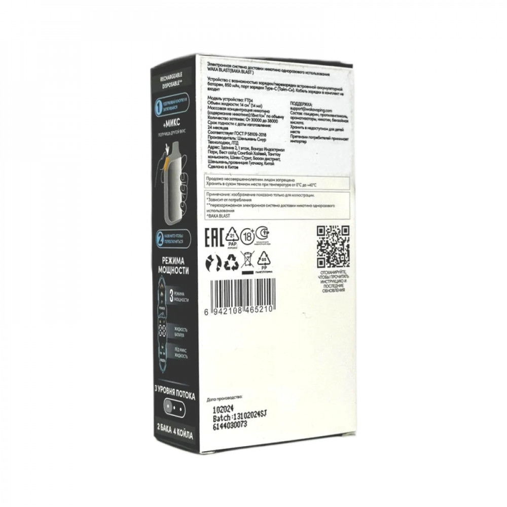 Технические характеристики WAKA BLAST 38000 Hard - Клубника арбуз + лед микс